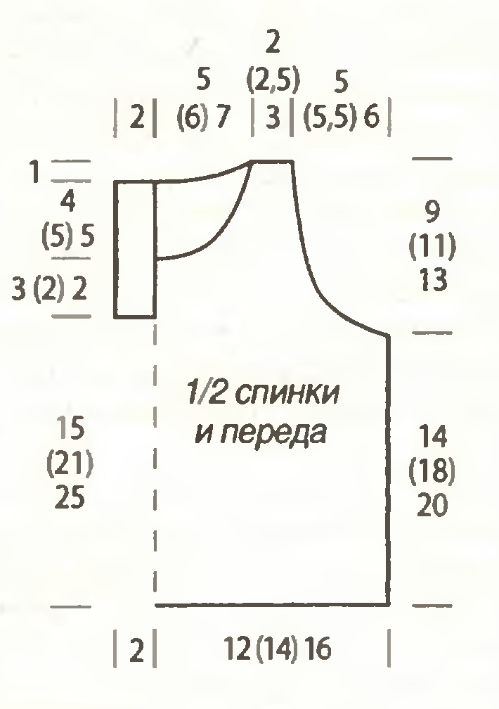Перед: вязать, как спинку, но без разреза и с более глубоким вырезом горловины Для этого через 18 (23) 27 см от наборного края закрыть средние 4 (6) 10 п. и обе стороны закончить раздельно, при этом в каждом 2-м р. закрыть 1 х 3, 1 х 2 и 1 (2) 2 х 1 п. и в следующем 4-м р. 1 х 1 п. На высоте спинки закрыть оставшиеся петли плеча.
